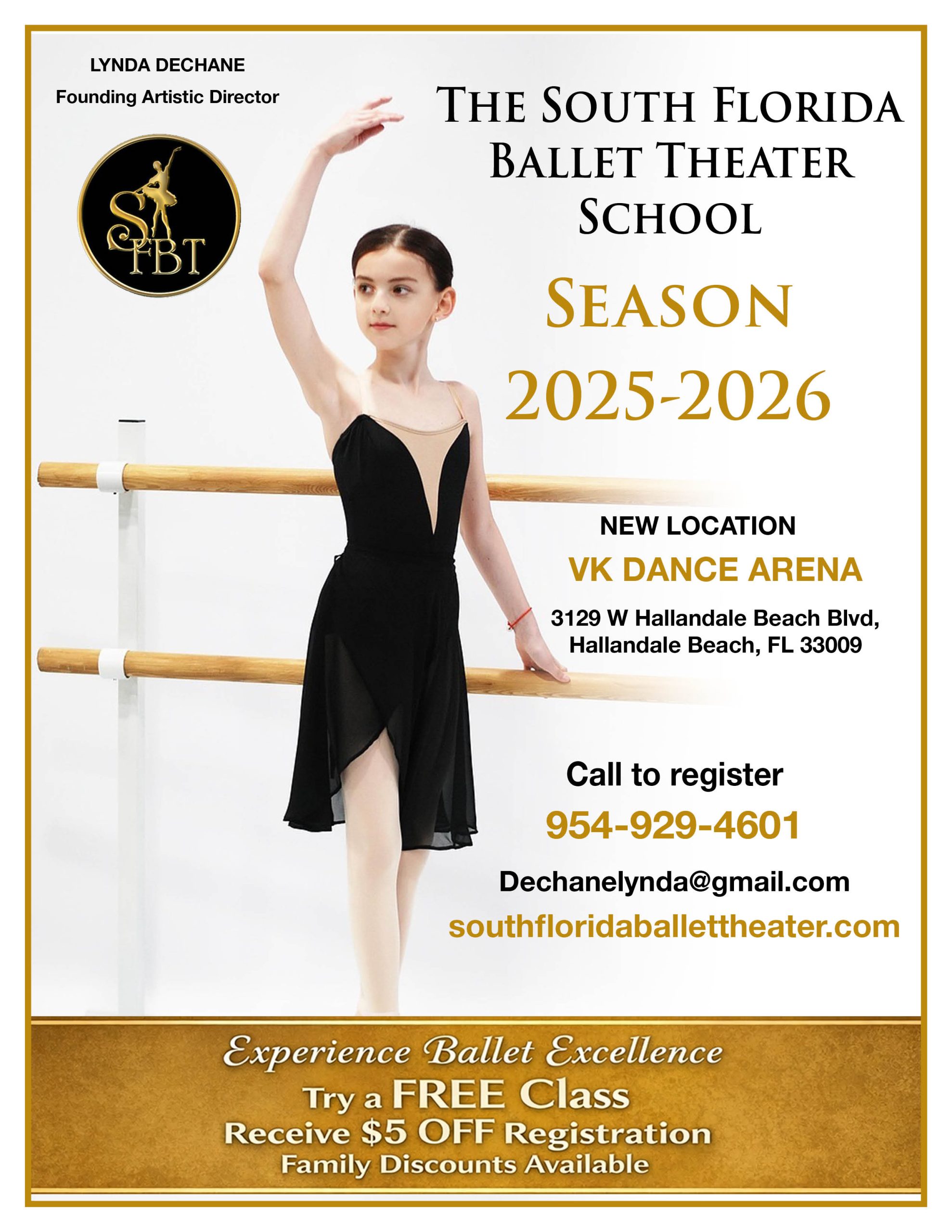 The South Florida Ballet Theater is a non- profit arts organization located in Hallandale Beach, Florida since 2002. The Mission of the South Florida Ballet & Musical Theater is to bring Classical Ballet training and Performances to South Florida audiences.